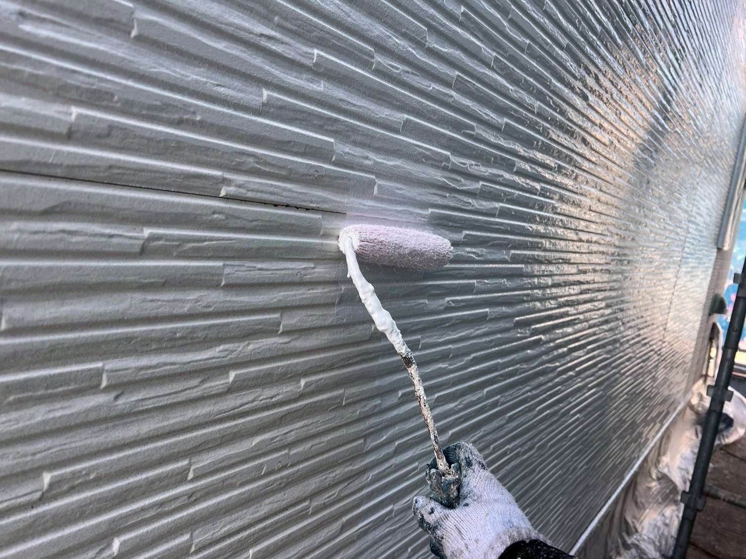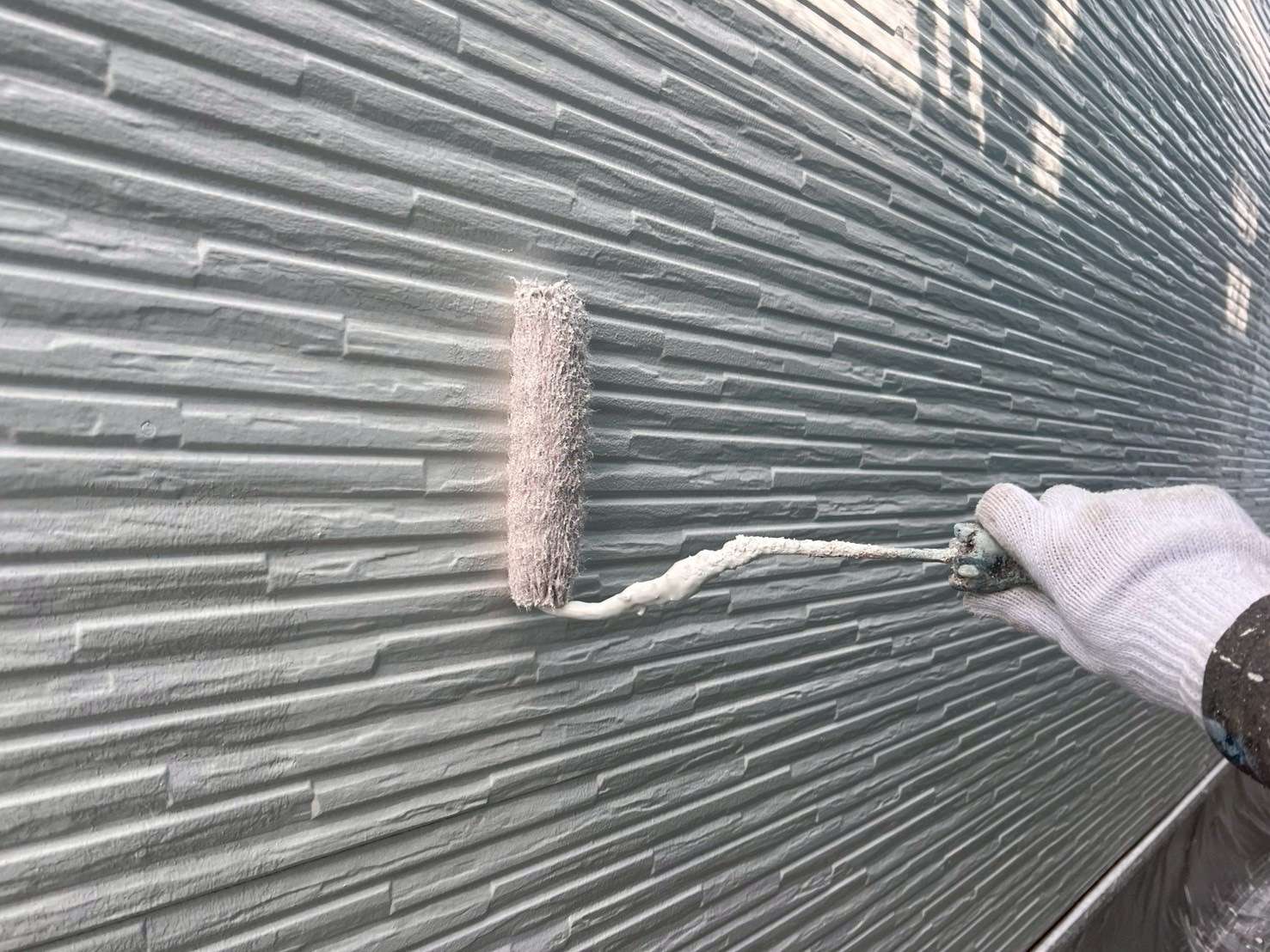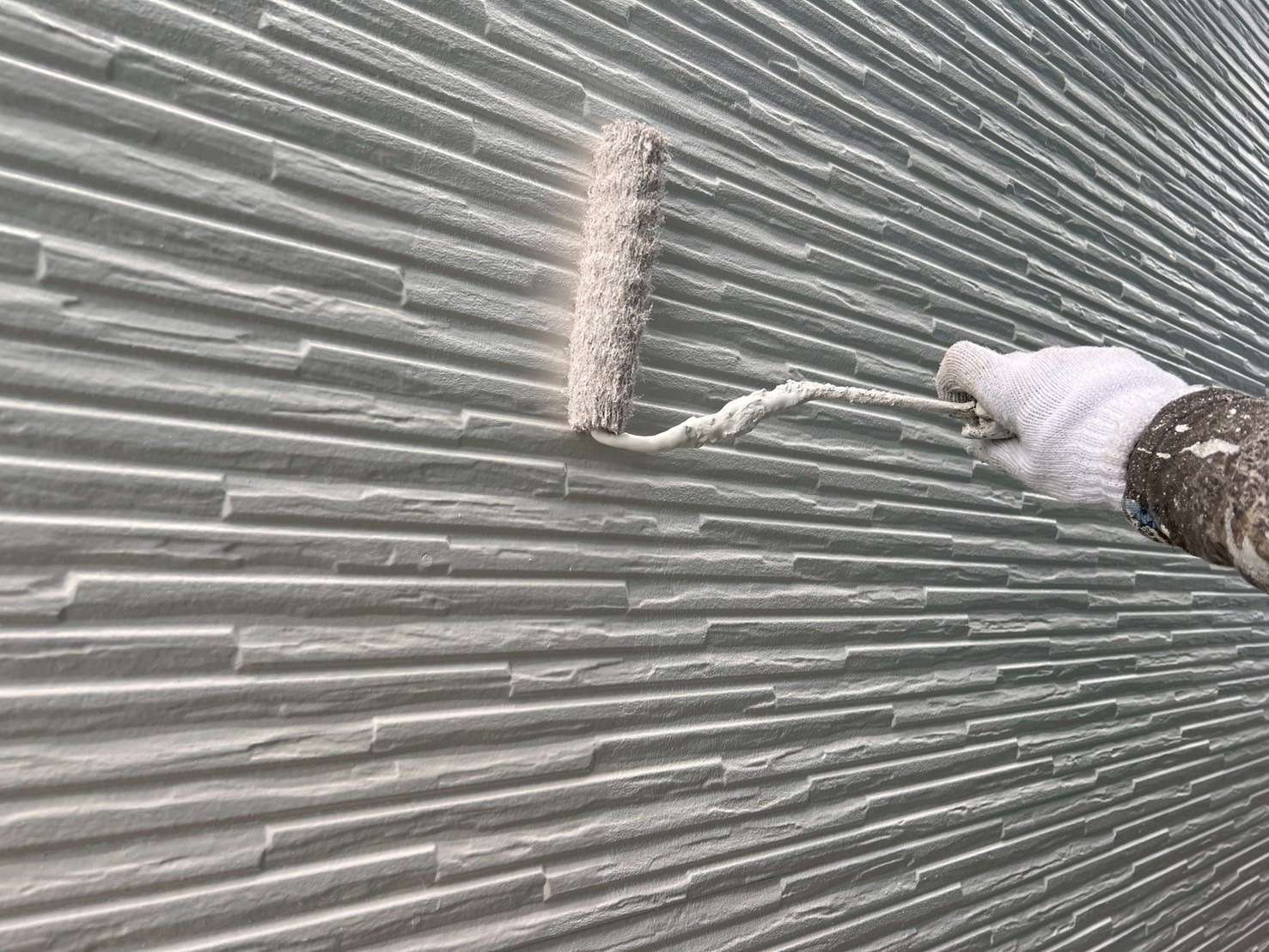 前回、タイル柄のサイディングを塗装して今回は、凹凸が多く更に塗料のたまりが出やすくなるので更にしっかりと確認しながら塗装をおこなっていきます。