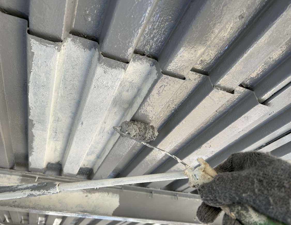 通路裏の鉄骨部分は、室内と違って高温多湿の影響を受けやすく、時間とともに塗膜が剥がれやすくなります。