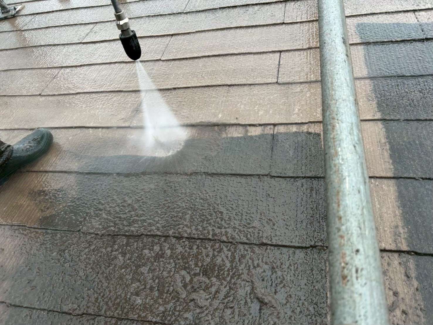 高圧洗浄は水を噴射するため、屋根が瞬時に濡れ、ツルツルになります。