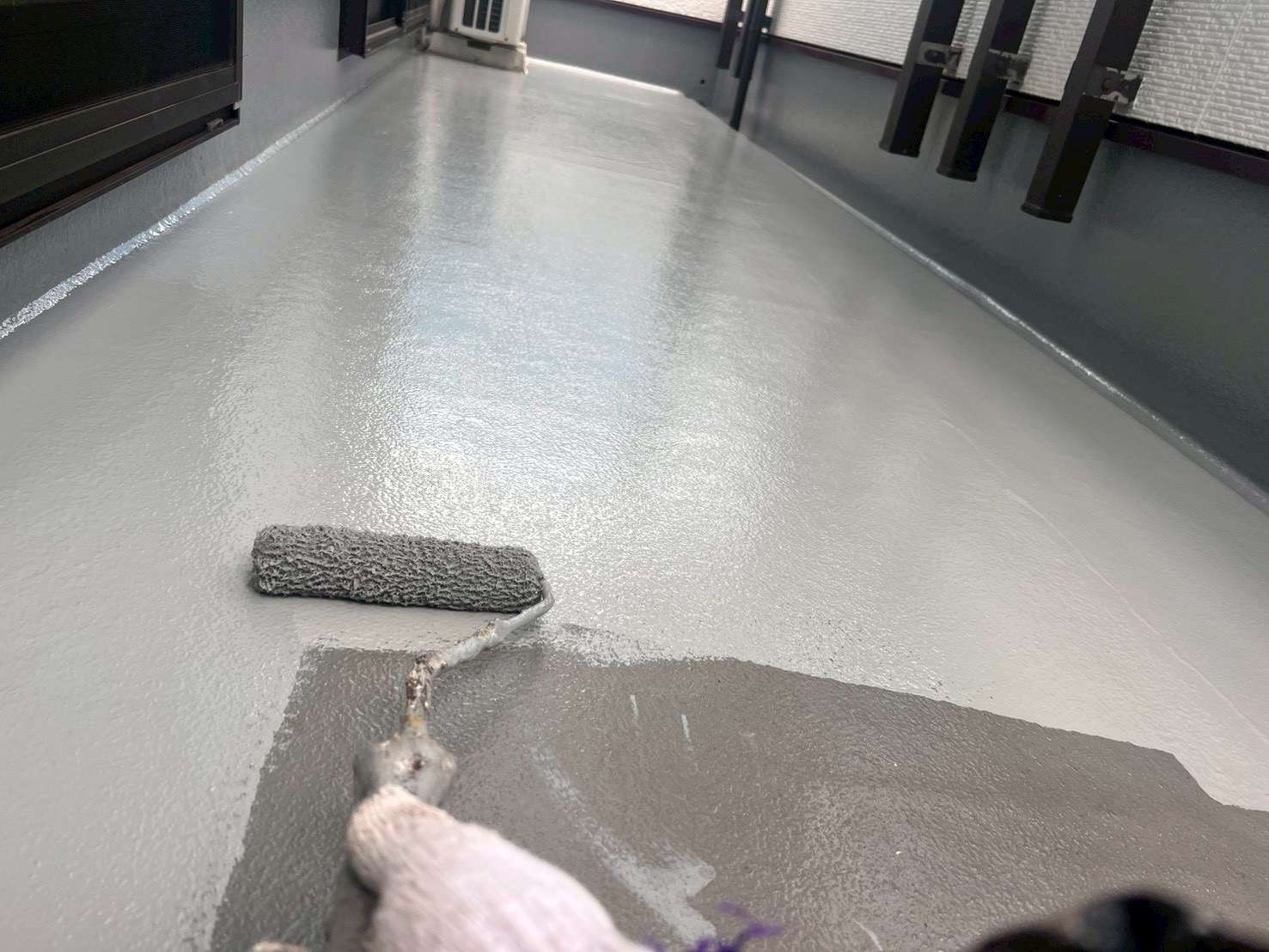 最後の仕上げとして行ったのが、ベランダ床の防水作業です。ここまで一つひとつの工程を積み重ねてきた分、完工が近づくにつれて、現場全体が整っていく様子を感じられる段階でもあります。