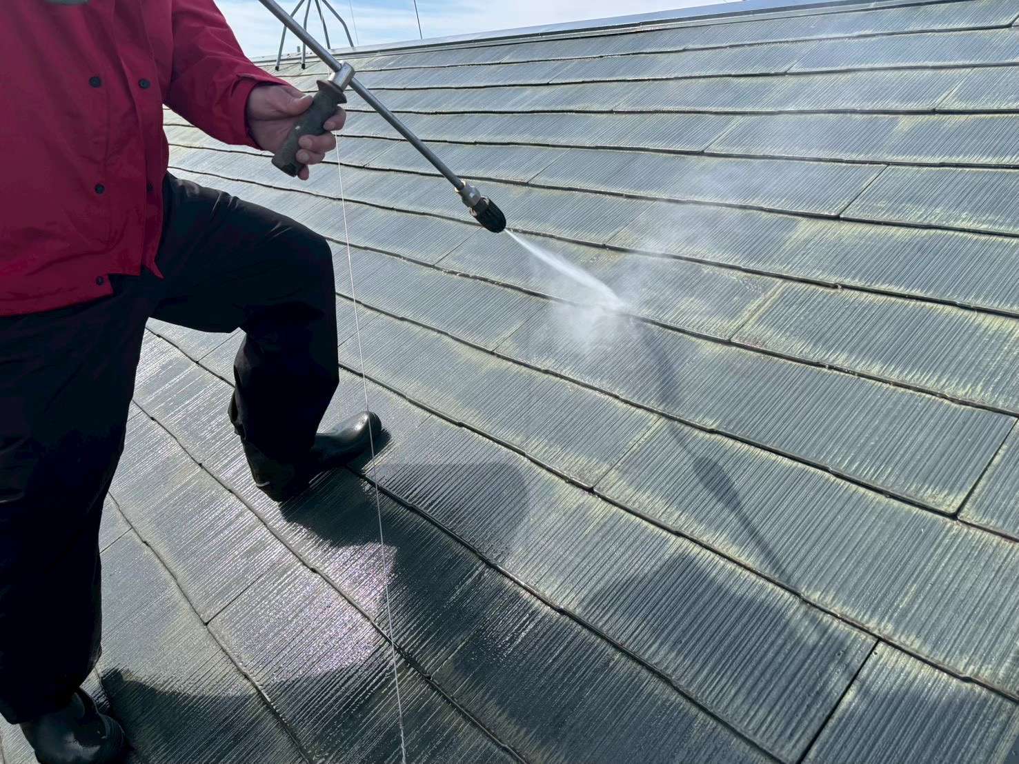 高圧洗浄では、屋根材を傷めないよう水圧を調整しながら、