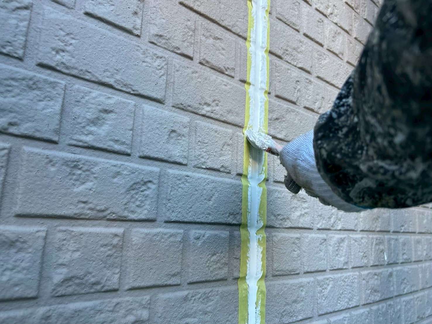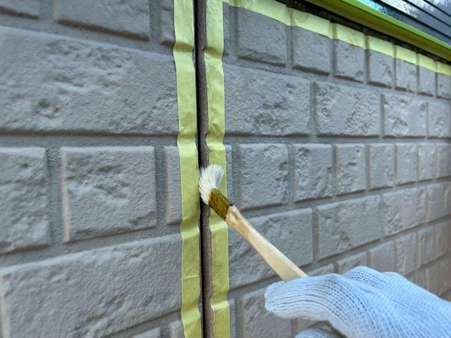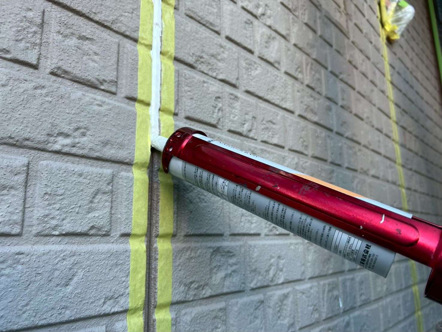 次に、コーキングが付着してほしくない部分をマスキングテープで養生します。その後、密着力を高めるためのプライマーを塗布し、新しいコーキング材を充填していきます。